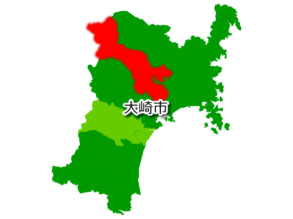 宮城県大崎市を示す画像を元に、目的地案内や出身地説明、ルート案内や学習コンテンツなどにご活用ください。