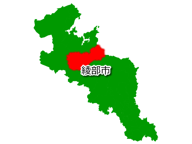 京都府綾部市を示す画像を元に、目的地案内や出身地説明、ルート案内や学習コンテンツなどにご活用ください。