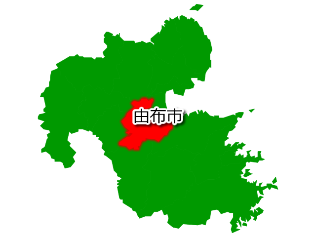 大分県由布市を示す画像を元に、目的地案内や出身地説明、ルート案内や学習コンテンツなどにご活用ください。